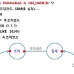 USE_HASH, FULL, PARALLEL 3가지 힌트절은 배치성 쿼리에서 가장 많이 사용되는 힌트절이다. 한마디로 대용량 데이터 처리 및 조회에 빈번하게 사용하는 힌트절이다. 위의 3가지 힌트절만 잘 조합하여 사용한다면 배치 튜닝에서 전혀 어려움이 없다. 힌트절을 사용함에 있어서 처음부터 3가지를 조합하여 사용하기 보다는 다음의 3단계로 나누어서 사용 여부를 검토해야 한다. 1. USE_HASH 힌트절만 사용해서 조회 가능한지 검토 -> 적당히 무거운 쿼리에 사용 2. 조회 범위가 크다면 FULL 힌트절 추가 사용을 검토 -> 대개 이 단계에서 튜닝 완료 3. 대용량 데이터의 빠른 처리가 요구될 때 PARALLEL 힌트절 사용 -> 제한적 사용 특히 PARALLEL 힌트절은 병렬 처리를 위한 힌트절이..