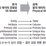 논리-물리 모델 변환 1. 논리 데이터 모델 – 물리 데이터 모델 변환 용어 2. 엔티티 – 테이블 변환가. 테이블 설명테이블은 데이터를 저장하기 위해서 생성된 데이터베이스에서의 가장 기본적인 객체이다. 1) 테이블(Table)테이블은 기본적으로 칼럼(Column)과 로우(Row)를 가진다. 각각의 칼럼은 지정된 유형의 데이터 값을 저장하는 데 사용된다.2) 로우(Rows)테이블의 한 로우에 대응. 튜플, 인스턴스, 어커런스라고도 한다.3) 칼럼(Columns)각 사원 개개인의 관리 항목에 대한 Value를 저장한다.4) 기본키(Primary Key)하나의 칼럼 혹은 몇 개의 칼럼 조합으로, 어떤 경우라도 테이블 내에 동일한 값을 갖는 튜플이 존재하지 않도록 한다.5) 외래키(Foreign Key)외부 ..